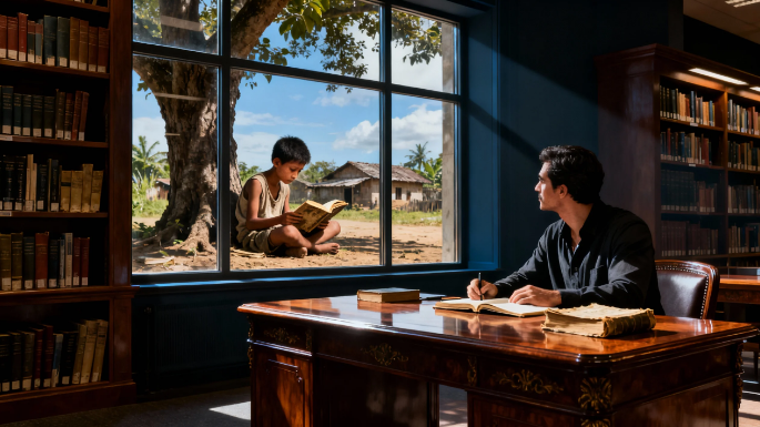 Sejak kecil, Raka kehausan akan ilmu seperti orang yang berjalan jauh tanpa air. Ia membaca apa pun yang bisa ia temukan. Koran bekas bungkus nasi ia luruskan dan keringkan. Buku pinjaman ia jaga seperti nyawa. Ia berburu buku bekas di pasar loak, meminjam dari teman, bahkan rela berjalan jauh hanya untuk duduk di toko buku dan membaca judul-judul di rak.